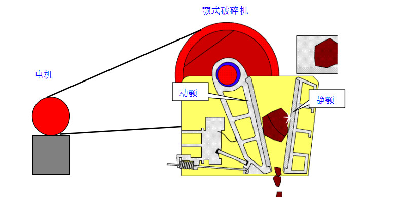 顎式破碎機工作部分是兩塊顎板組成,靜止的是定顎,另一個做上下往復(fù)運動的是動顎。動顎與靜顎不停的分開和靠近,物料進入破碎腔,受到擠壓,彎折和劈裂作用而破碎。