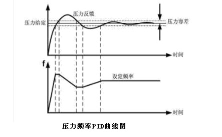 變頻調(diào)速系統(tǒng)將管網(wǎng)壓力作為控制對象,裝在管網(wǎng)中的壓力傳感器將管網(wǎng)的壓力轉(zhuǎn)變?yōu)殡娦盘査徒o變頻器進行PID運算,與壓力給定值進行比較,并根據(jù)差值的大小,產(chǎn)生控制信號去調(diào)節(jié)變頻器的輸出電壓和逆變頻率,調(diào)整電動機的轉(zhuǎn)速,從而使實際壓力始終維持在給定壓力。