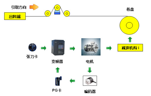如下圖1所示,收卷的恒張力控制,是按照工藝將系統(tǒng)收卷所需的張力及空、滿盤卷徑設置到張力卡,張力卡根據(jù)運行線速度,計算出當前卷徑,進而得到收卷所需的轉矩并將其給到變頻器,再由變頻器進行轉矩控制。在收卷過程中,系統(tǒng)可自動實時計算當前的卷徑,以保證收卷張力的恒定。同時系統(tǒng)張力錐度的設置可使材料較好的卷曲成型。