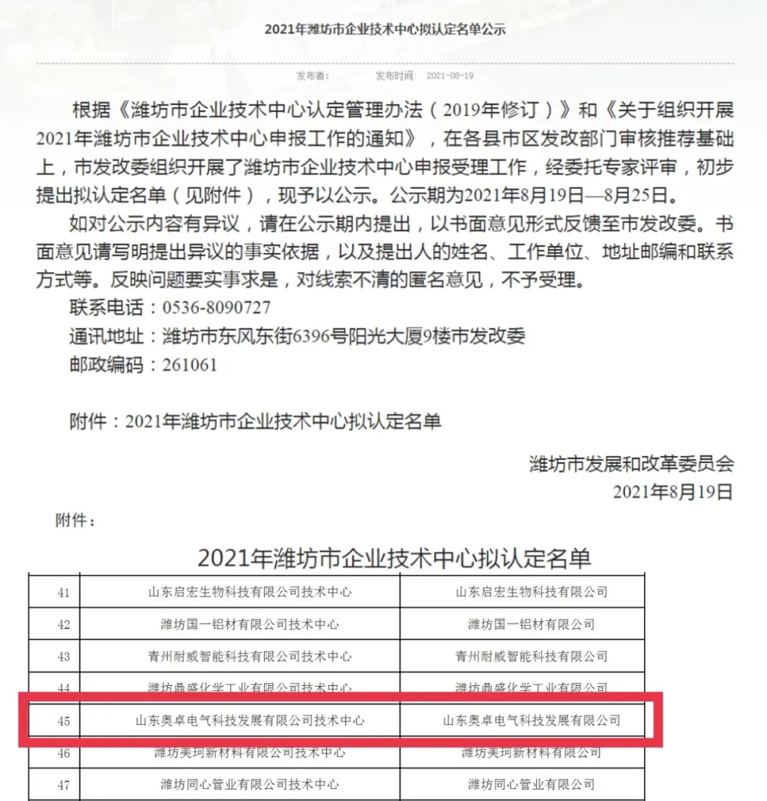 2021年8月19—25日,濰坊市發(fā)展和改革委員會(huì)公示了“2021年濰坊市企業(yè)技術(shù)中心擬認(rèn)定名單”,并于8月26日完成認(rèn)定,山東奧卓電氣科技發(fā)展有限公司榮獲“濰坊市企業(yè)技術(shù)中心”稱號(hào)?!盀H坊市企業(yè)技術(shù)中心”是為鼓勵(lì)企業(yè)創(chuàng)新發(fā)展,發(fā)揮企業(yè)在產(chǎn)業(yè)技術(shù)創(chuàng)新中的主體作用而設(shè)立的市級(jí)研發(fā)平臺(tái),是對(duì)企業(yè)具有行業(yè)領(lǐng)先的技術(shù)創(chuàng)新能力和水平的權(quán)威認(rèn)可。