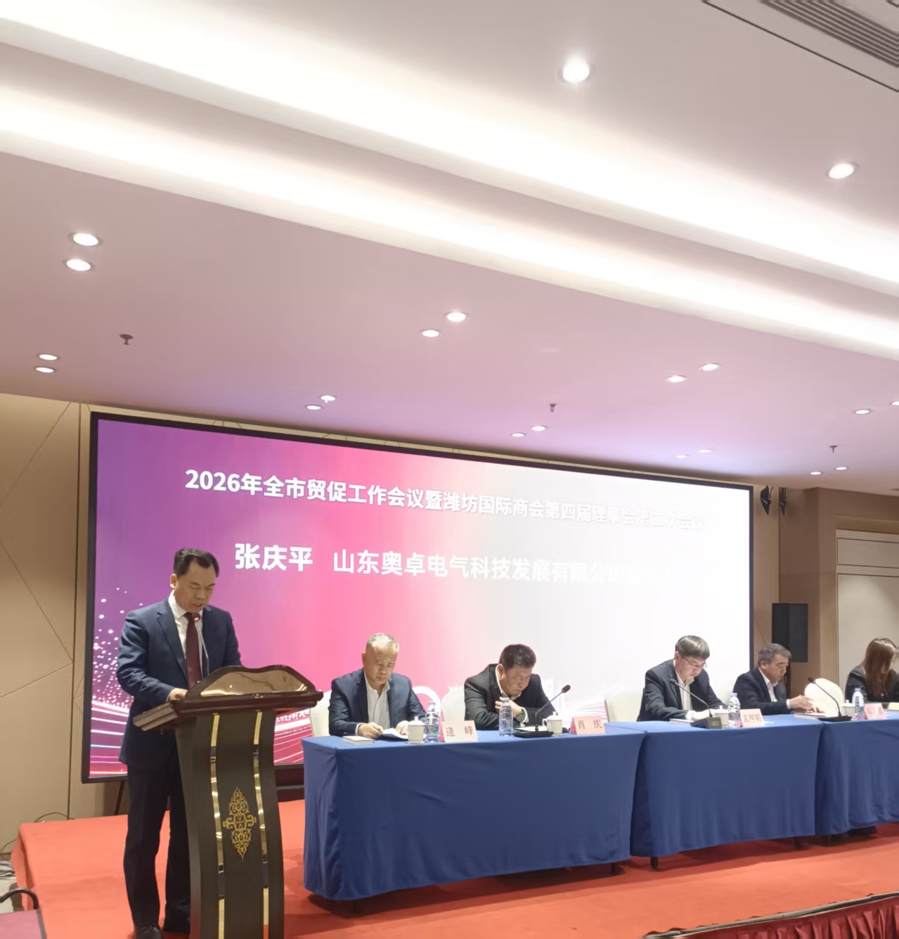 會上,傳達(dá)了全國貿(mào)促工作會議、全省貿(mào)促工作會議、全市工作動員大會及市領(lǐng)導(dǎo)批示精神,通報(bào)了2025年度工作表現(xiàn)突出貿(mào)促機(jī)構(gòu)、工作表現(xiàn)突出商會會員企業(yè)。山東奧卓電氣科技發(fā)展有限公司作為中國國際商會濰坊商會副會長單位、中亞濰坊總商會會長單位憑借在國際經(jīng)貿(mào)合作、商會共建、企業(yè) “走出去” 等方面的突出成效,榮獲中國國際商會濰坊商會 2025 年度工作表現(xiàn)突出會員企業(yè),張慶平董事長作為會員企業(yè)代表在會上做交流發(fā)言,會后接受了媒體采訪。