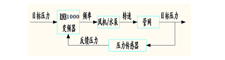 變頻調(diào)速系統(tǒng)以輸出壓力/流量作為控制對象,由變頻器、壓力傳感器、電機構(gòu)成的閉環(huán)恒壓控制系統(tǒng),工作壓力值可由操作面板直接設(shè)置,現(xiàn)場壓力由壓力傳感器檢測,轉(zhuǎn)換成電信號后反饋給變頻器。變頻器通過其內(nèi)置PID進行比較計算,從而調(diào)節(jié)其輸出頻率,達到恒壓供水和節(jié)能的目的。