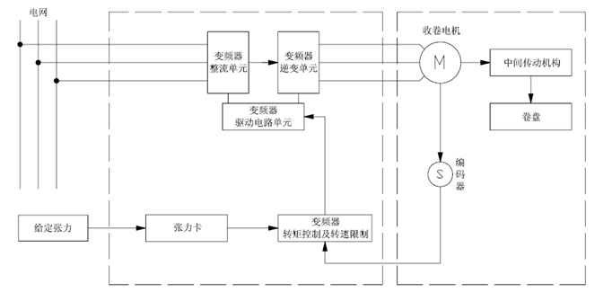 如下圖1所示,收卷的恒張力控制,是按照工藝將系統(tǒng)收卷所需的張力及空、滿盤卷徑設置到張力卡,張力卡根據(jù)運行線速度,計算出當前卷徑,進而得到收卷所需的轉矩并將其給到變頻器,再由變頻器進行轉矩控制。在收卷過程中,系統(tǒng)可自動實時計算當前的卷徑,以保證收卷張力的恒定。同時系統(tǒng)張力錐度的設置可使材料較好的卷曲成型。