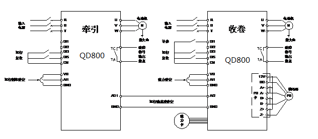 吹膜機是一種將塑料粒子加熱融化并吹成薄膜的設備,主要由吹膜和收卷兩部分組成。其中收卷部分的作用是將吹制出的薄膜卷取成卷,并使成卷的薄膜平整無皺紋, 卷邊整齊, 卷軸上的薄膜要松緊適中,以防止薄膜拉伸變形,保證質(zhì)量,因此收卷時必須采用恒張力控制。目前行業(yè)內(nèi)主要使用力矩電機來實現(xiàn)上述控制,但在使用過程中存在著需手動調(diào)節(jié),操作不方便,長時間運行時力矩電機發(fā)熱較高,其控制器較易損壞,可靠性不高的缺點。本文擬結合奧卓QD系列變頻器,介紹一種針對吹膜機收卷的恒張力控制系統(tǒng),在保證收卷工藝的同時可顯著提高設備的操作簡易性和可靠性。