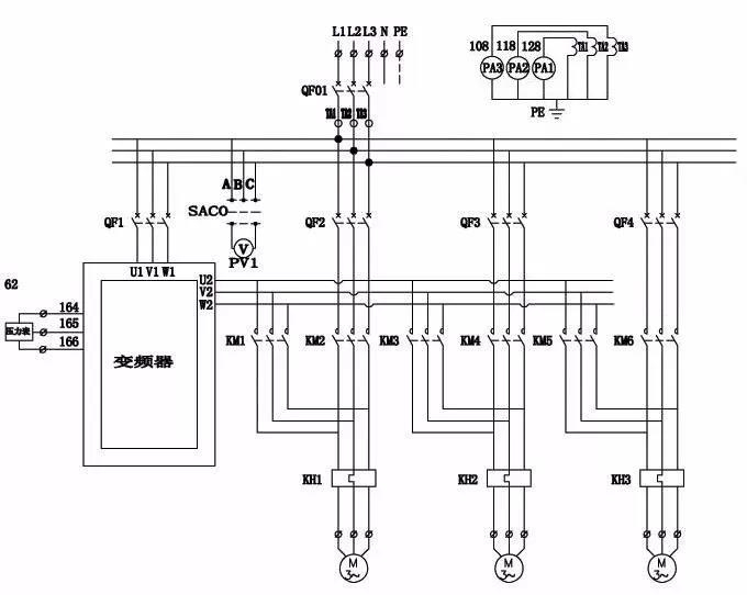 那么變頻器如何實現一拖多的功能?下面僅僅對一次電氣原理圖做出示例。二次電氣原理圖需要根據控制要求設計,此處暫不贅述。