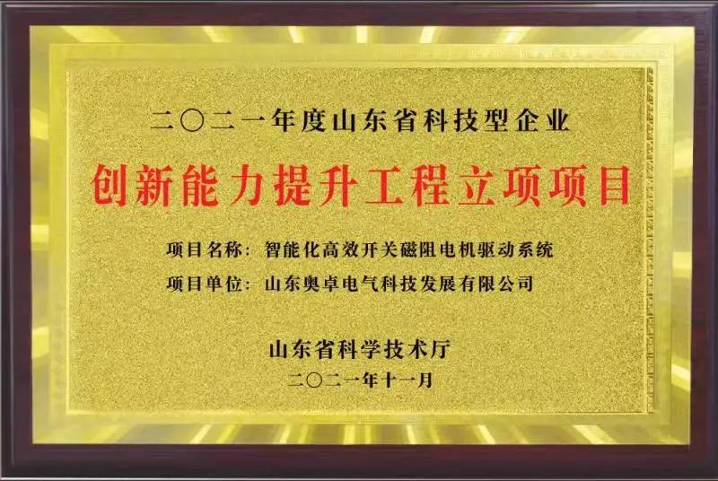 2021年11月4日,經(jīng)過山東省科學(xué)技術(shù)廳“關(guān)于2021年山東省科技型中小企業(yè)創(chuàng)新能力提升工程擬立項(xiàng)項(xiàng)目公示的通知”的公示,山東奧卓電氣科技發(fā)展有限公司的“智能化高效開關(guān)磁阻電機(jī)驅(qū)動(dòng)系統(tǒng)”項(xiàng)目成功入選2021年山東省科技型中小企業(yè)創(chuàng)新能力提升工程。