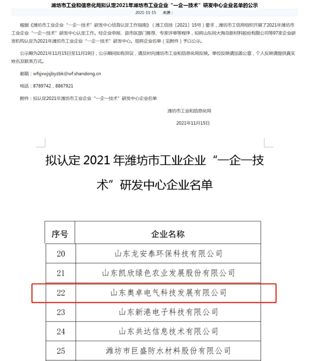 2021年11月20日,經(jīng)過濰坊市工業(yè)和信息化局關(guān)于2021年濰坊市工業(yè)企業(yè)“一企一技術(shù)”研發(fā)中心企業(yè)名單的公示,山東奧卓電氣科技發(fā)展有限公司榜上有名,成功入選濰坊市工業(yè)企業(yè)“一企一技術(shù)”研發(fā)中心企業(yè)。