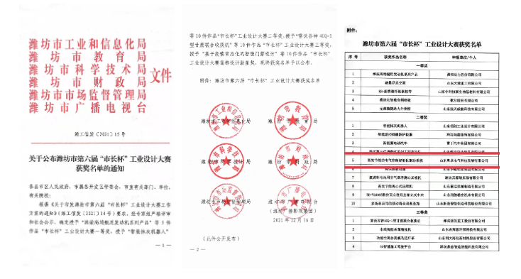 2021年12月28日,濰坊市第六屆“市長杯”工業(yè)設計大賽頒獎典禮在富華國際會議中心隆重舉行。山東奧卓電氣科技發(fā)展有限公司的參賽作品“高效節(jié)能的電氣控制智能化驅動系統(tǒng)”項目經(jīng)過參賽作品征集和資格審查、作品評審及答辯、社會公示、展示點評等環(huán)節(jié)的層層篩選,在幾百件作品中脫穎而出,榮獲濰坊市第六屆“市長杯”工業(yè)設計大賽二等獎。等領導出席頒獎典禮并為獲獎單位頒獎。